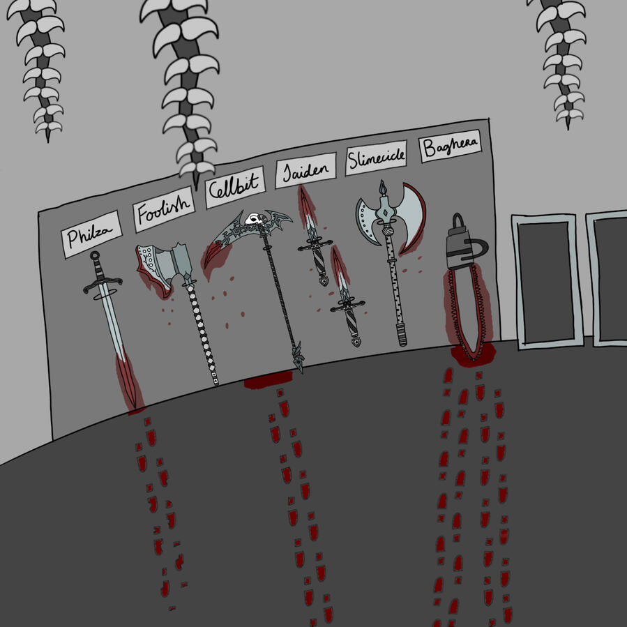 There's no stream counterpoint to this shot of the weapons rack. I included this in here to explain the details of the shot.The shot is set in the 2nd Bolas Base in the mountains. I decided to have each team member to have a different weapon. From the streams, I know Philza prefers a sword when fighting and BagheraJones was the first team member to use a chainsaw so I designed those weapons for those characters. For the others, I went through what weapons were in the game and what weapons were in the medieval era as those weapons were the easiest to make and craft with limited resources.For the bloody footprints on the ground, I thought of who killed the most people and who's weapon drew the most blood. Baghera's chainsaw would draw the most blood so she had the most bloody footprints. Cellbit had the most kills so I gave him the second biggest pool of blood. Finally, Philza had the second most amount of kills as he was protecting his teammates so he got the smallest pool.