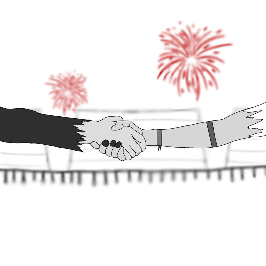 The shot of Philza shaking hands with Tubbo was inspired by the ending of Purgatory. To win the event, the first leader to kill the other twice wins, it was best of three. Philza won both times meaning Team Bolas won Purgatory. There were no hard feelings between Philza and Tubbo after the fight with Philza carrying Tubbo to the escape ship after a bomb was detonated.