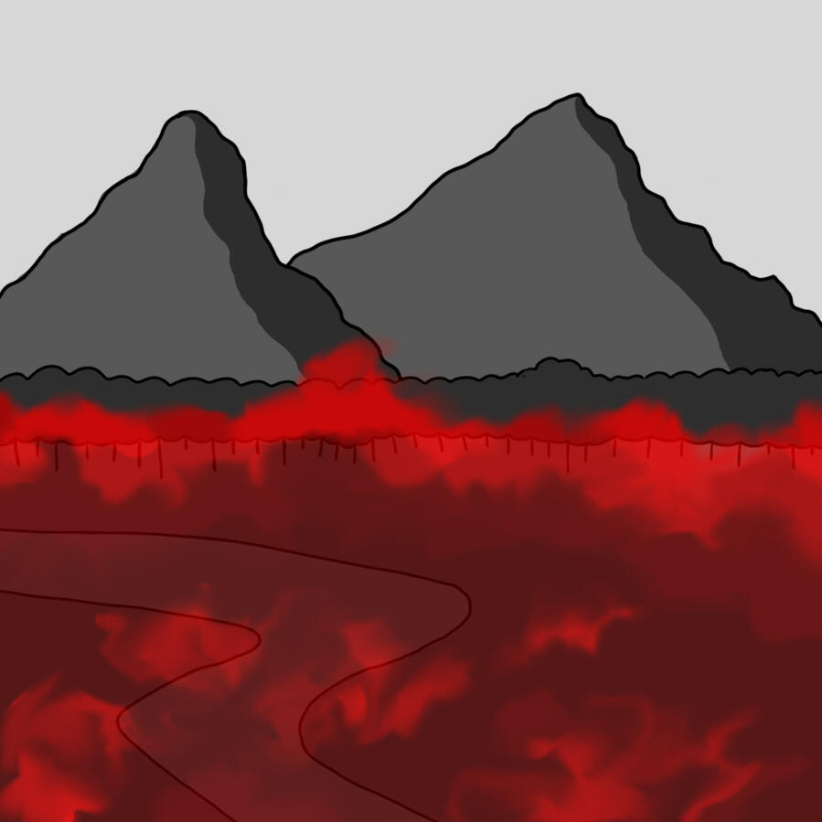 The shot of the mountains and the red smoke is the toxic gas. In QSMP Purgatory, there were disasters initiated by the admins. These disasters included earthquakes, acid rain, hunger, snowstorms and toxic gas. During the disaster, if someone fails to put the gas mask on, they suffocate and die. Team Bolas decided on Day 1 to always wear the gas masks constantly and began to pray that the disaster wheel chose toxic gas.The clip below is from the Egg Event during Purgatory. It shows the team and their reaction when the toxic gas was chosen. It also shows what the gas looked like in the game.